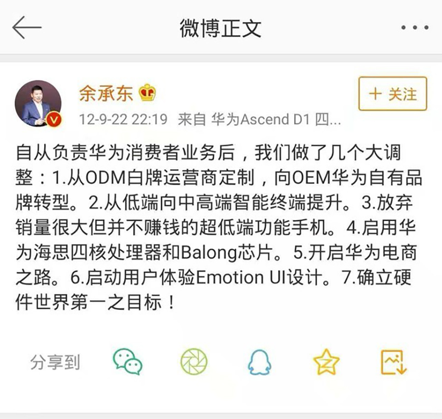 他與團(tuán)隊(duì)研討后,形成了華為終端的“七大戰(zhàn)略”,絕大部分涉及技術(shù)領(lǐng)域,特別是芯片領(lǐng)域。他選擇將這些戰(zhàn)略史無(wú)前例地在微博上公開(kāi),以期在外部形成壓力后倒逼內(nèi)部改革。事后,他半開(kāi)玩笑地說(shuō),那時(shí)華為終端過(guò)于弱小,反正也沒(méi)有人相信,微博發(fā)就發(fā)了。別人不信,但華為信就好。