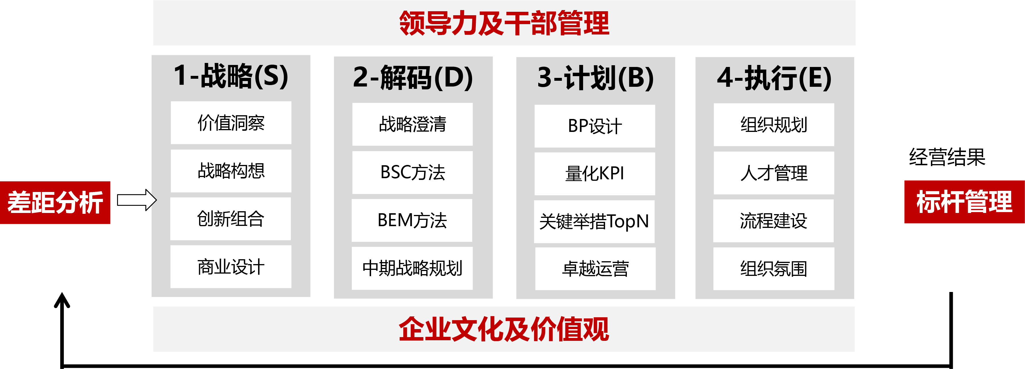 在SDBE領(lǐng)先模型-戰(zhàn)略到執(zhí)行框架中,差距分析是SDBE方法的起點(diǎn)和終點(diǎn),差距不止,戰(zhàn)略不停,而與標(biāo)桿之間的差距是戰(zhàn)略的起點(diǎn)和終點(diǎn)。