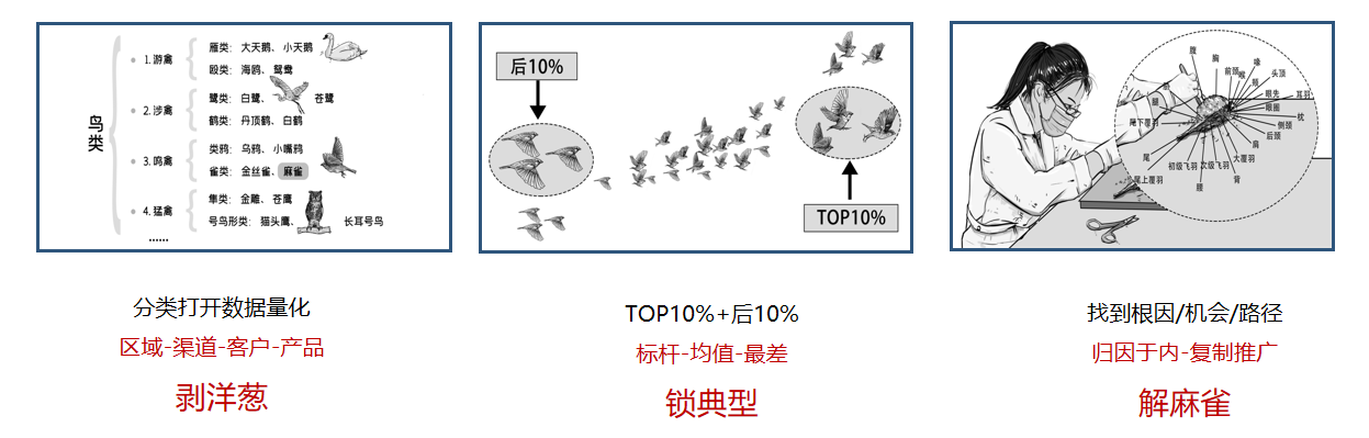 把洋蔥一層層撥開(kāi),識(shí)別差距、找到典型后,進(jìn)行麻雀解剖,看看是腰部問(wèn)題,還是頭部問(wèn)題,進(jìn)一步找到根因/機(jī)會(huì)/路徑,歸因于內(nèi)進(jìn)行問(wèn)題解決,優(yōu)秀經(jīng)驗(yàn)復(fù)制推廣。