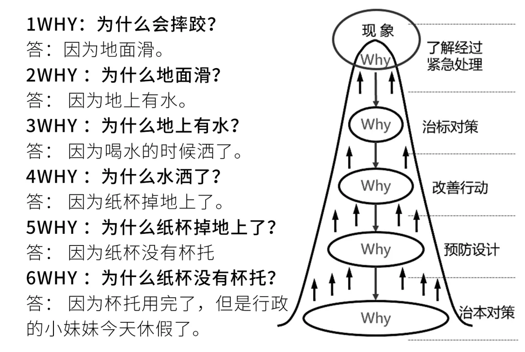 注意:5why的分析不是隨意進(jìn)行的,要朝解決問(wèn)題的方向分析;5why不是一定必須問(wèn)到5個(gè)why,有可能3個(gè),也可能10個(gè) 。