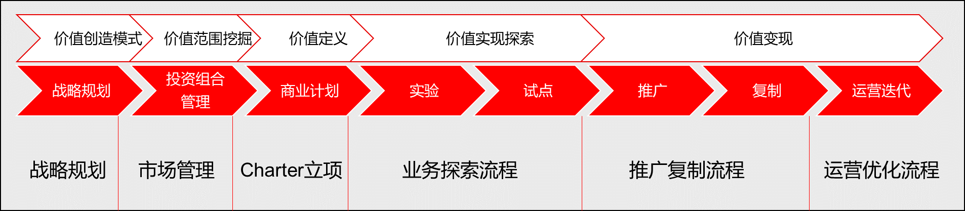 業(yè)務創(chuàng)新變革方法分成3層,最上面是價值層,中間是流程層,最下面是方法層。所有的業(yè)務都是為客戶創(chuàng)造價值,價值創(chuàng)造可以分為這幾個階段:價值創(chuàng)造模式->價值范圍挖掘->價值定義->價值實現(xiàn)探索->價值變現(xiàn),對應的流程層分為這幾個階段:戰(zhàn)略規(guī)劃->投資組合管理->商業(yè)計劃->試驗->試點->推廣->復制->運營迭代,而每個階段又有對應的方法:戰(zhàn)略規(guī)劃->市場管理->Charter立項->業(yè)務探索流程->推廣復制流程->運營優(yōu)化流程。