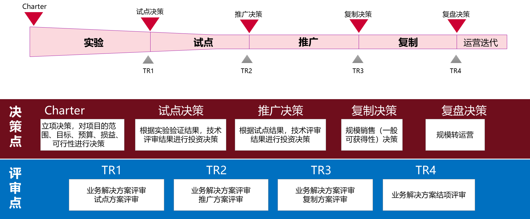 推廣、復制階段是為了價值變現(xiàn),這階段會投入大量的資源進行推廣復制,意味著在進入這階段前,各項業(yè)務指標要達到要求。我們采用IPD的方法,結合業(yè)務創(chuàng)新的過程,在每個階段設置了評審點和決策點,對業(yè)務基線指標進行評審把關,保證過程質(zhì)量。