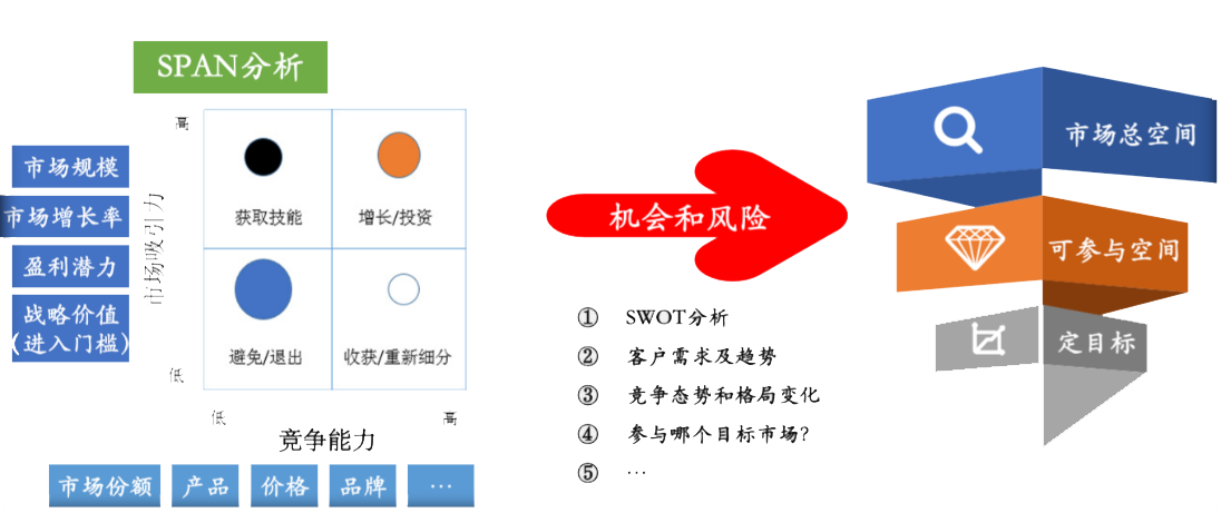 業(yè)務創(chuàng)新變革一般會以項目群形式運作,項目群里面每個項目對應一個業(yè)務,為了使有限的資源投入到最能產(chǎn)生價值的項目(業(yè)務)上,需要進行投資組合管理。投資組合管理的目的是進行價值范圍挖掘,在公司戰(zhàn)略(業(yè)務邊界和模式)確定后,對市場進行洞察,再結合公司的競爭能力,識別出最值得投資的業(yè)務。
