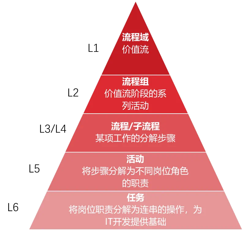 流程架構(gòu)分級本質(zhì)是從戰(zhàn)略指引、價值流逐步細化到可執(zhí)行的分解過程,如下圖所示。